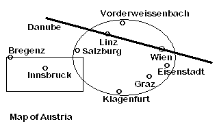 R(1;E;9;83;122;134) L(3;67;26;309;91) T(M;40;45;"Danube") T(M;14;176;"Map of Austria") T(M;231;77;"O") T(M;220;89;"Wien") T(M;214;116;"o") T(M;196;128;"Graz") T(M;153;54;"o") T(M;145;67;"Linz") T(M;109;78;"o") T(M;120;80;"Salzburg") T(M;62;104;"o") T(M;40;115;"Innsbruck") T(M;11;88;"o") T(M;12;79;"Bregenz") T(M;175;38;"o") T(M;147;25;"Vorderweissenbach") T(M;240;100;"o") T(M;230;110;"Eisenstadt") T(M;170;138;"o") T(M;150;150;"Klagenfurt") |