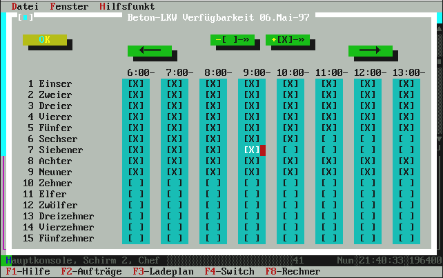 mehr als laut Auftragsbestellmenge noch zur Restlieferung gebraucht wird. Normalerweise genügt hier also einfach die [Enter]-Taste für OK und damit wird die Fuhre im Ladeplan eingetragen. Übrigens: in der oberen Zeile, wo die Uhrzeit-Leiste dargestellt ist, sehen Sie die Belegung der Mischanlage mit lila Kästchen angezeigt. Die Liste zeigt (je nach Fenstergröße) ca. 4-6 LKW aus beliebig vielen. Das ist ein Roll-Fenster. |