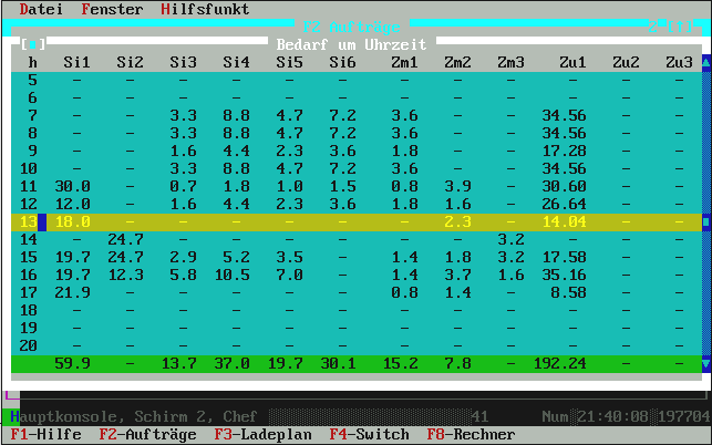 mehr als laut Auftragsbestellmenge noch zur Restlieferung gebraucht wird. Normalerweise genügt hier also einfach die [Enter]-Taste für OK und damit wird die Fuhre im Ladeplan eingetragen. Übrigens: in der oberen Zeile, wo die Uhrzeit-Leiste dargestellt ist, sehen Sie die Belegung der Mischanlage mit lila Kästchen angezeigt. Die Liste zeigt (je nach Fenstergröße) ca. 4-6 LKW aus beliebig vielen. Das ist ein Roll-Fenster. |