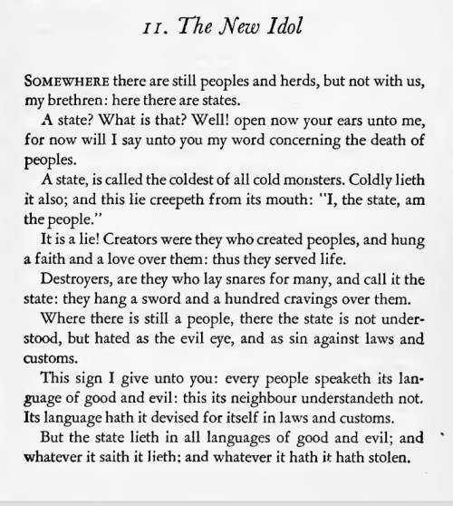 Vom neuen Götzen english The New Idol Same URL as above for .pdf VERY LARGE FILE page 49 Thus spake Zarathustra. 11. The New Idol SOMEWHERE there are still peoples and herds, but not with us, my brethren: here there are states. A state? What is that? Well! open now your ears unto me, for now will I say unto you my word concerning the death of peoples. A state, is called the oldest of all cold mousters. Coldly lieth it also; and this lie creepeth from its mouth: "I, the state, am the peopke." select or scroll down to page 49 please