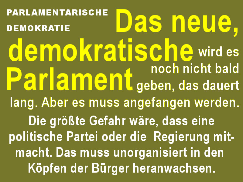 DEMOKRATIE GESCHIEHT IM PARLAMENT. NICHT BEI DER PRÄSIDENTENWAHL, NICHT IN DEN PARTEIEN, NICHT IN DER REGIERUNG UND NICHT IN IHRER BÜROKRATIE UND NICHT BEI IHREN BERATERN, NICHT IN DER KUNST, NICHT IN DER WISSENSCHAFT, NICHT IN DER LITERATUR UND NICHT IN REDAKTIONEN. | ||||||||||||||||||||||||||